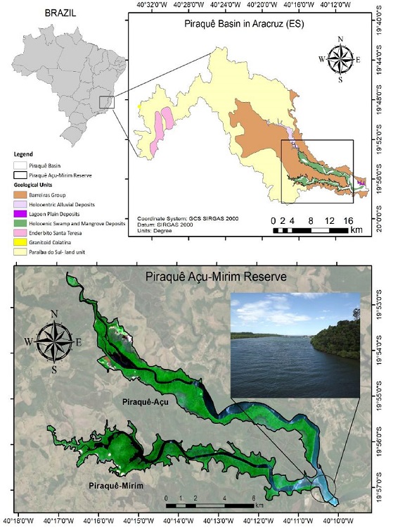 This specific mangrove forest is, at the same in two estuarine systems that are part of the Reserva de Desenvolvimento Sustentável Municipal Piraquê Açu-Mirim, which comprises a 2079 hectares area in the Municipality of Aracruz (ES), in Southeast Brazil. This Reserve is enclosed in the Piraquê micro basin, having as main rivers the Piraquê Açu and Piraquê Mirim, which when they meet, near the mouth, present a shape analogous to the letter Y (Figure 01). In this location, water depths vary from 4 to 16 meters (LANA; BERNARDINO, 2018).