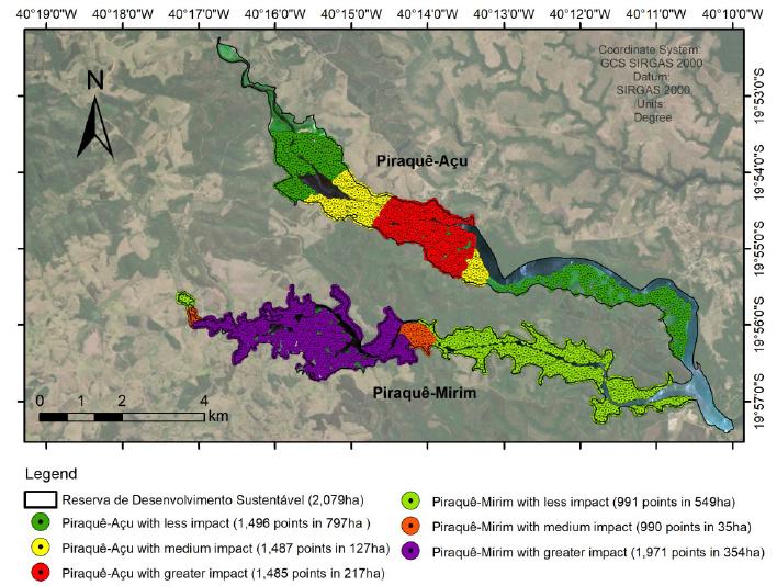 As the RDS is composed of two estuaries (Piraquê-Açu e Piraquê-Mirim) and as they had different repercussions about the event, they were analyzed separately and subdivided in major, medium and minor impact. As the subdivisions were made, it began the third procedure of this phase, the generation of sampling points. These, in turn, were randomly generated using the Create Random Points tool from the ArcGIS® software.