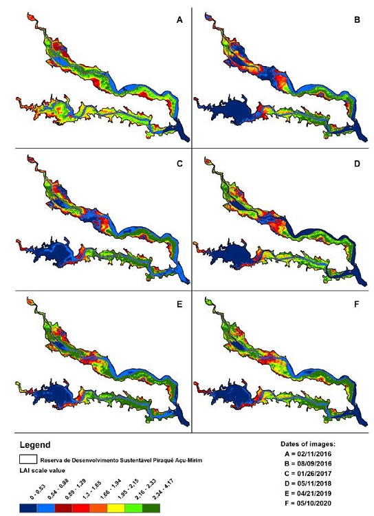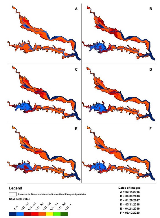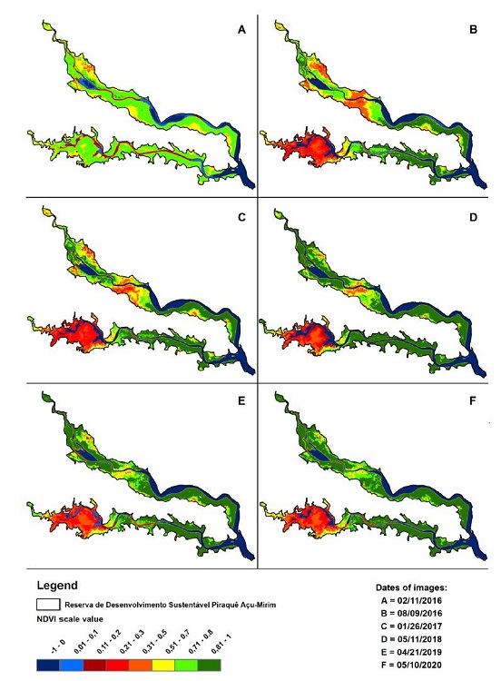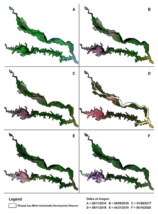 At this phase, the goal was to organize the datakeeping a correlation between the figures presented, that is, for each image data used to generate the indexes and the composition of bands, a letter of the alphabet was assigned. This organization aimed to facilitate the articulation of ideas in the topic referring to the discussion of results. So, for these products, all letters correlate as follows: (A) to the date of February 11th. 2016; (B) on August 2016; (C) on January 26 2017; (D) on May 11, 2018; (E) on April of 2019; and (F) on May 10, 2020.