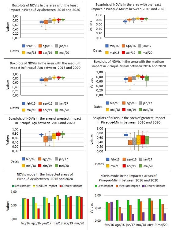 Differences on the regeneration capacity of the mangroves, in the medium impact areas and in both estuaries, what the mode graphics show is that, while in Piraquê-Açu, in 2017 the NDVI value had already surpassed what was registered before the event, at Piraquê-Mirim this happened only in 2018. When analyzing the boxplot graphics (Figure 07) in the estuaries for the whole period, it can be noticed a differentiation among the values, showing that, after the hailstorm, at PM the numbers are more spread than at the PA. Despite the differences, when comparing all the products, the recovery of the areas is remarkable.