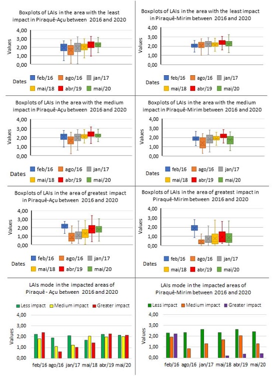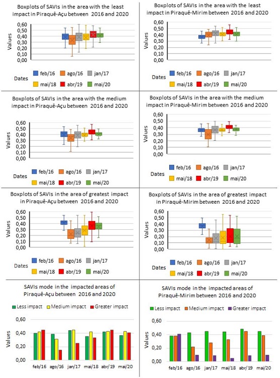 Regarding that, when comparing statistical graphics to the indexes products, it is possible to perceive that in the areas rated as minor impact there were no traces of alterations by the storm. Based on the mode graphics, from each index between 02/11/2016 and 10/05/2020, data showed that, for Piraquê-Açu, the LAI values decreased around 3.5%, the SAVI values decreased 7% and the NDVI values increased 13.5%. Yet, for Piraquê-Açu, the registered values increased, being: 5.5% for LAI; 18.5% for SAVI; 15% for NDVI. Still about the minor impact, when analyzing the NDVI images, there is an impressive increase in the values, indicating an improvement in the mangrove’s health within this period.