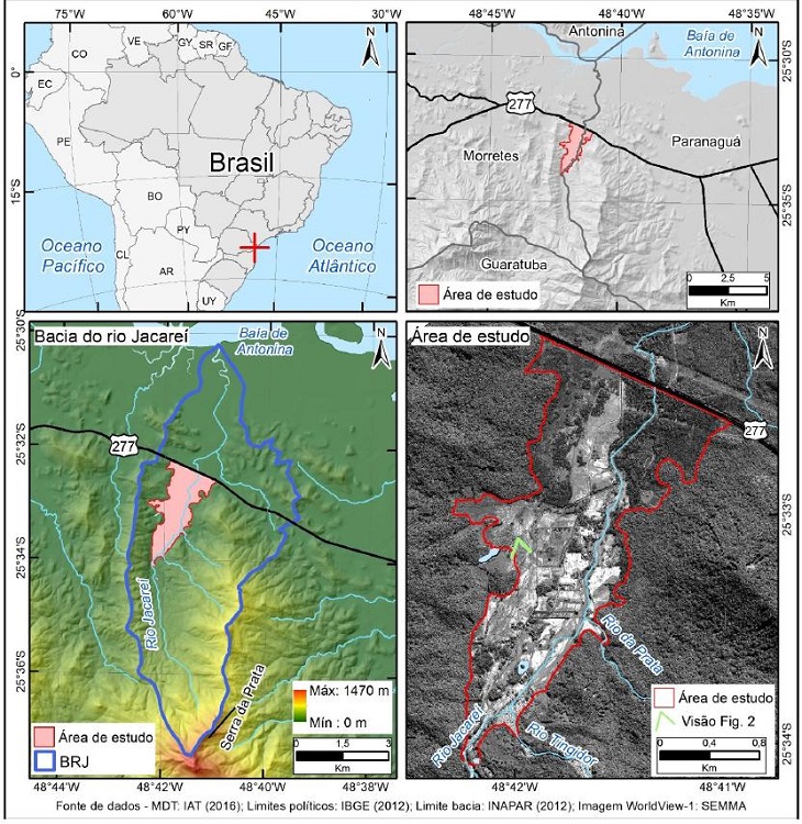 A planície do rio Jacareí situa-se entre os municípios de Paranaguá e Morretes, no litoral Paraná. A área de estudo foca em um trecho da planície aluvial, limitado entre a cota de 30 metros e o aterro da rodovia BR 277, porção mais afetada pelo evento de março de 2011 (Figura 1). A jusante do aterro, a planície do rio Jacareí é composta por mosaico de depósitos fluviais, marinhos, fluviomarinhos e paludais (ANGULO, 2004; MINEROPAR, 2006). A bacia do rio Jacareí (BRJ) apresenta 41,28 km², enquanto o recorte da planície analisado neste estudo apresenta 2,86 km².