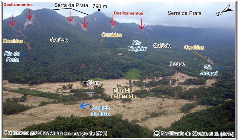 Exemplo deste processo é encontrado em parte da planície do rio Jacareí (litoral do Paraná), fortemente afetada por processos gravitacionais em março de 2011, que formaram depósitos nos canais intramontanos, nas desembocaduras e na planície aluvial (PINTO et al, 2012; SILVEIRA et al., 2013). Este recorte espacial e temporal torna a planície do rio Jacareí uma área de estudo ideal pois ainda é possível identificar em campo os impactos do evento nos registros sedimentares da planície, estando os mesmos bem preservados.