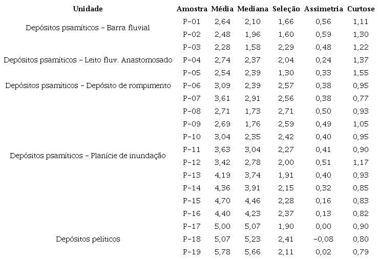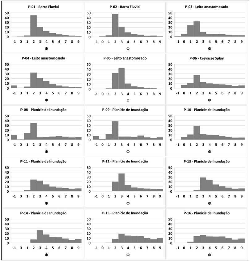 As amostras coletadas nos depósitos psamíticos foram classificadas entre areia fina (3 φ) a areia muito fina (4 φ), sendo que na maioria dos casos o pico do histograma ocorreu na classe areia média (2 φ), com exceção das amostras P-05, P-12 e P-16 (pico em areia fina - 3 φ). As subunidades psamíticas “barra fluvial” e “leito fluvial anastomosado” apresentaram os maiores teores de areias (acima de 78%) (Figura 5). Do ponto de vista textural, as amostras destas unidades foram classificadas como “areia franca”, com exceção da amostra P-05 que foi classificada como “areia” (86,47% de areia). Em todas as amostras psamíticas foi constatado clastos de baixa esfericidade, sub-angulosos a muito angulosos.