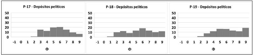 O material da unidade “depósito de rompimento” foi classificado como “franco arenoso”. As amostras P-07 a P-14, coletadas na planície de inundação soterrada, também foram classificadas como “franco arenosas”. Nestas unidades, as amostras P-04, P-08 e P-09 apresentaram-se cascalhentas. As amostras P-15 e P-16 registraram os menores teores de areia das amostras coletadas nos depósitos psamíticos, classificadas como “franca”. As amostras P-17 a P-19 se referem aos depósitos pelíticos, com o diâmetro médio classificado como “silte médio” (Figura 6). As amostras apresentaram em média 59% do material em silte, resultando na classificação textural “franco siltoso”.