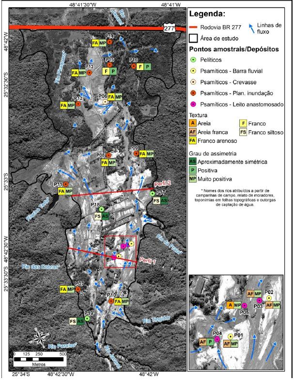 As amostras P-01 a P-12 situam-se nas porções montante e média da planície aluvial, enquanto as amostras P-13 a P16 encontram-se na porção jusante (próximo a BR 277). O mapeamento das linhas de fluxo (Figura 8) indica dois sentidos principais de água e sedimentos durante o evento, sendo que ambos têm início no ponto no qual o rio Jacareí adentra a planície aluvial e se encontram nas proximidades da BR 277. O primeiro flui próximo às vertentes da Serra da Prata, seguindo o leito fluvial anastomosado até o depósito de rompimento. O segundo fluí nas proximidades das vertentes a oeste, adentrando as proximidades do rio Piraquara.