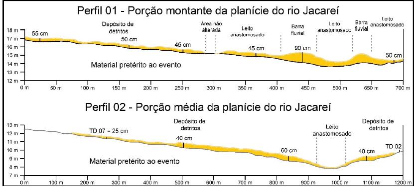 Os processos gravitacionais de deslizamentos e corridas de lama e detritos na bacia hidrográfica do rio Jacareí em 2011 resultaram em depósitos psamíticos e psefíticos que cobriram cerca de 91% da planície aluvial. Os depósitos psamíticos foram os mais expressivos (≅ 88%), classificados como areia franca a franco arenoso, estimado em 1.7 milhão de toneladas de sedimentos.