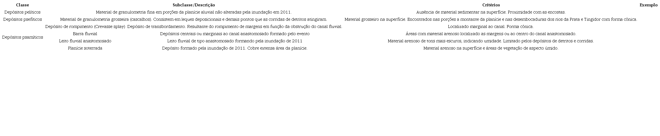 Áreas não afetadas pelo evento foram classificadas como depósitos pelíticos (finos), considerando granulometria predominantemente em silte e argila, já descrito em estudo anterior (PAZ; PAULA, 2021). Depósitos psefíticos (cascalhos) foram identificados observando presença de material grosseiro na imagem orbital. Depósitos psamíticos (areias) foram identificados considerando o material na superfície e aspecto úmido da vegetação (afetada pela inundação), sendo subdividido em classes conforme posição na paisagem e morfologia.