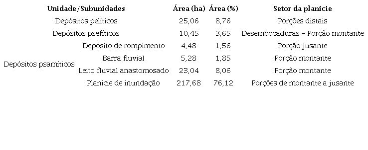 Os depósitos psamíticos predominam na planície aluvial (87,59%), sendo a subunidade planície de inundação a maior (76,12%), distribuída entre as porções montante a jusante da área de estudo (Figura 4 e Tabela 3). Os depósitos pelíticos encontram-se nas extremidades laterais na área e em fragmentos de vegetação, áreas não afetadas pela inundação de março de 2011. Os depósitos psefíticos, resultantes das corridas de detritos, são encontrados nas desembocaduras dos rios Jacareí, Tingidor e da Prata, onde formaram leques (ou cones de dejeção), se estendendo até os canais intramontanos. Nestas áreas são encontrados clastos com diâmetro maior de 150 cm, classificados como matacões, sendo circundados por blocos, seixos e grânulos. Exceção no leque no rio da Prata, onde predominam grânulos.