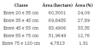 Os 108 pontos amostrais de espessura apresentaram valores desde 20 cm, nas extremidades laterais da planície aluvial, até 120 cm, em uma barra fluvial circundada pelo leito anastomosado. A espessura média foi de 50 cm. O volume total dos depósitos psamíticos foi estimado em 1.13 milhão m³, equivalente a 1.7 milhão de toneladas de sedimentos. Para melhor analisar a distribuição dos depósitos na planície, o modelo gerado foi dividido em classes (Tabela 6). Transectos foram traçados sobre a planície visando observar a variação longitudinal dos depósitos (Figura 9).