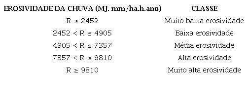 Conforme descrito na introdução, a escolha do método IPD se deve ao fato do interpolador apresentar desempenho satisfatório para a obtenção de estimativas anuais do índice de erosividade (LI; HEAP, 2008; ELBASTI et al., 2013; OLIVEIRA et al., 2015; TEIXEIRA et al., 2021). Para representar espacialmente a erosividade anual, considerou-se dois métodos de classificação: intervalo natural (natural breaks) e as classes propostas por Carvalho (2008) adaptadas de Foster et al. (1981). Dessa forma, a primeira classificação foi adotada para avaliar o agrupamento dos valores intrínsecos aos dados de erosividade; e para fins comparativos com outros mapas, adotou-se também a classificação propostas por Carvalho (2008), conforme a Tabela 1.