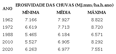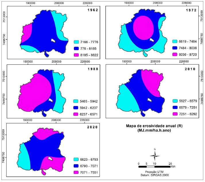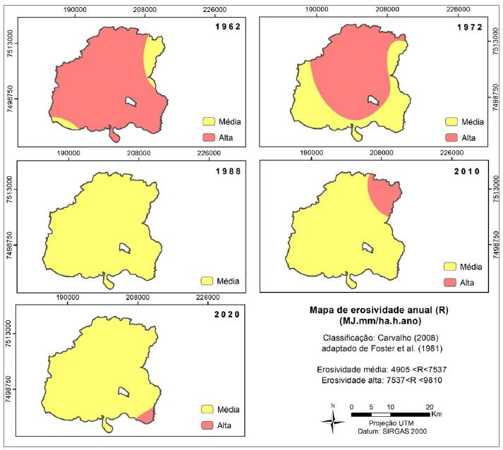 Considerando todos os dados de chuva da região, o índice de erosividade anual médio para o ano de 1960 foi 7.972 MJ mm ha-1 h-1 ano-1; para o ano de 1972 foi de 7.713 MJ mm ha-1 h-1 ano-1; para o ano de 1988, 6.184 MJ mm ha-1 h-1 ano-1; para o ano de 2010, 6.905 MJ mm ha-1 h-1 ano-1; e para o ano de 2020 o valor obtido foi 6.977 mm ha-1 h-1 ano-1, como mostra a Tabela 2. Assim, todos os valores obtidos representam chuvas com potencial erosivo de médio a alto.