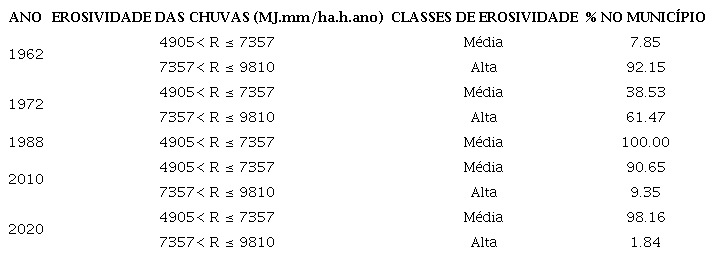 Assim, chuvas classificadas com alto poder erosivo ocorreram em 1962 e 1972, com percentual significativo no município, isto é, 92 e 61% respectivamente (Tabela 3). Para os anos de 1988, 2010 e 2020, a maioria da região foi classificada como potencial médio, com percentual de ocorrência acima de 90%.