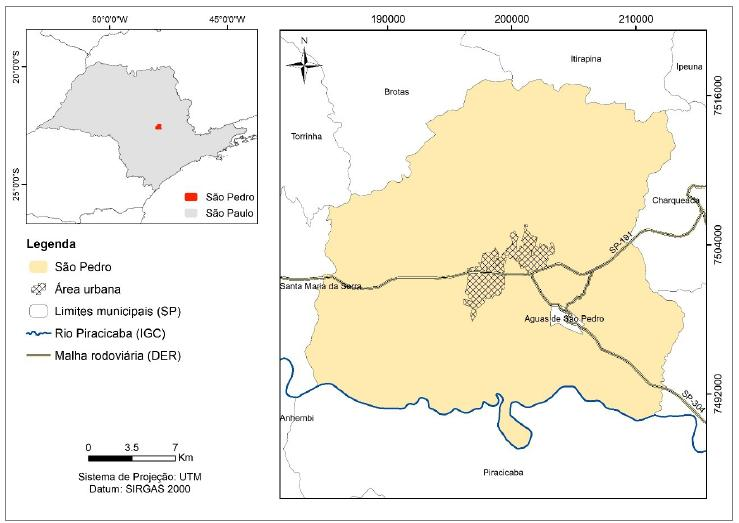 A área em estudo compreende o município de São Pedro, localizado na região centro-leste do estado de São Paulo (Figura 1). O município é limitado pelas coordenadas UTM 183000 e 214000 E, e 7480000 e 7517000 N, e apresenta uma área de 611 km² e população estimada de 36.298 habitantes.