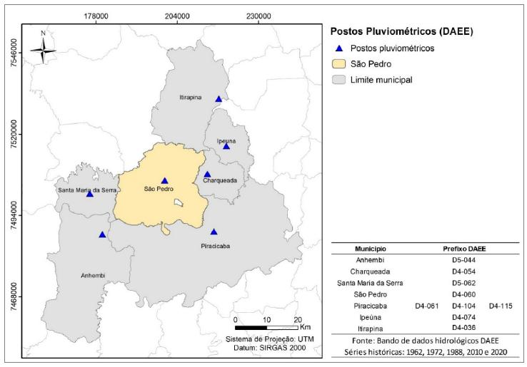 Para calcular o índice de erosividade considerou-se os dados de chuva mensal de 1962, 1972, 1988, 2010 e 2020 disponíveis no banco de dados hidrológicos do Departamento de Águas e Energia Elétrica (DAEE, 2020). Considerando os postos pluviométricos localizados próximo da área estudada, selecionaram-se os dados de chuva disponíveis para os municípios Anhembi, Charqueada, Ipeúna, Itirapina, Piracicaba, Santa Maria da Serra e São Pedro (Figura 2).