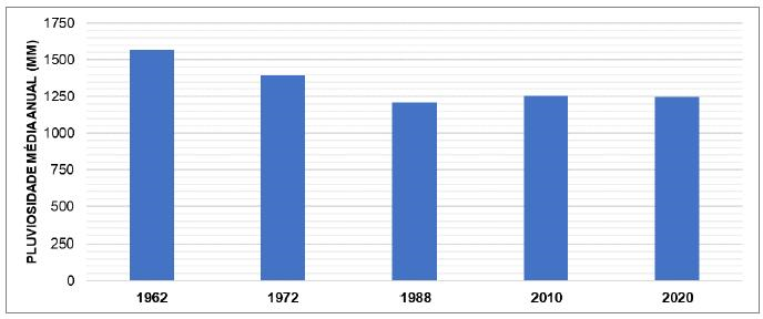 Os dados dos postos pluviométricos localizados na região de São Pedro, mostraram que a pluviosidade média anual para o período de 1962 a 2020 variou de 1209 a 1572 mm/ano (Figura 3). Comparando os anos de 1962, 1972, 1988, 2010 e 2020, o ano mais chuvoso foi 1962, com precipitação média anual de 1572 mm/ano; já o menos chuvoso foi 1988, com média anual de 1209 mm/ano. Segundo Perez-Filho et al. (2011), precipitações pluviométricas elevadas, em torno de 1400 mm/ano, ocorrem de forma acentuada na região, devido ao efeito orográfico das Serras de São Pedro.