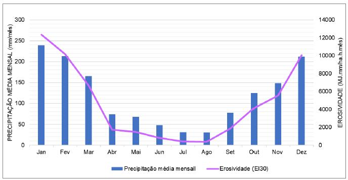 Com relação a erosividade, é possível observar maior potencial nos meses de dezembro, janeiro e fevereiro, com valores máximos superiores a 10.000 MJ mm ha-1 h-1 ano-1, devido aos índices pluviométricos elevados. Segundo a classificação de Carvalho (2008), esses valores caracterizam as chuvas com alto poder erosivo. Além do mais, segundo Perez-Filho et al. (2011), a estação chuvosa contribui com o aumento da intensidade das precipitações e, consequentemente, da sua capacidade erosiva. Neste contexto, precipitações com alta intensidade podem favorecer tanto a deflagração quanto evolução das erosões na região (DANTAS-FERREIRA, 2008).