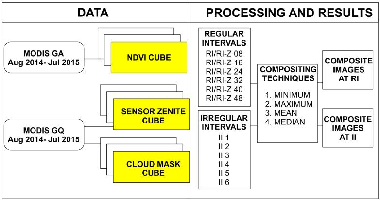 Abstract: One challenge in the study of optical remotely sensed time series in the Amazon is the constant cloud cover. The present study evaluates different compositing techniques using regular and non-regular intervals to obtain cloud-free images over large areas. The study area was the municipality of Capixaba, State of Acre, belonging to the Amazon region. The tests considered four compositing algorithms (maximum, minimum, mean, and median) for daily MODIS sensor data (b1 and b2, 250m). The compositing technique from regular intervals adopted the following periods: 8, 16, 24, 32, 40, and 48 days. The irregular interval composite images adopted different composition intervals for dry seasons (April to September) and rainy (October to March). The cloud mask and viewing angle constraint allowed to obtain information without atmospheric interference and closest to the nadir view. The composite images using regular intervals did not allow for overcoming the high frequency of cloud cover in the region. The composite images from non-regular intervals presented a higher percentage of cloud-free pixels. The mean and median methods provided a better visual appearance of the images, corroborating with the homogeneity test. Therefore, composite images from non-regular intervals may be an appropriate alternative in places with constant cloud coverage.