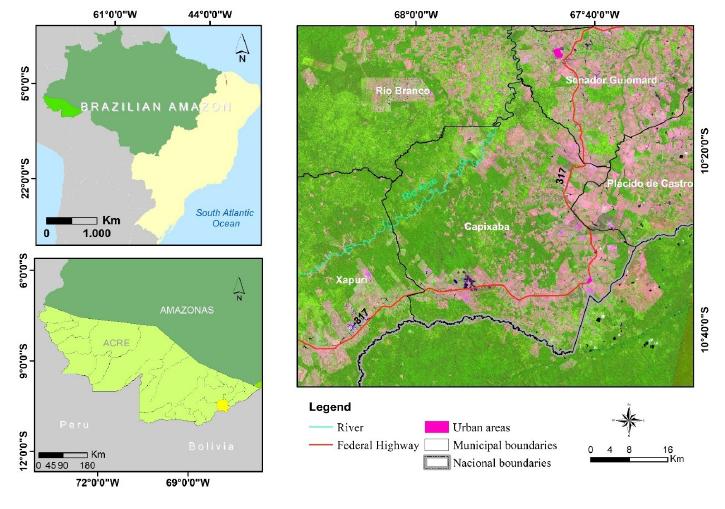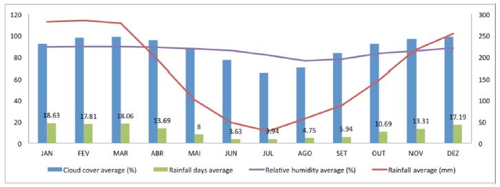 The study area was the municipality of Capixaba (State of Acre) located in the Brazilian Western Amazon (Figure 2). The municipality occupies 170,257.70 hectares and it has a diversity of land use, and occupation types (land reform settlements, extractive reserves and, private property). It was the second-largest producer of sugarcane in the State (IBGE, 2016), housing a sugarcane industry for ethanol and sugar. The climatic conditions of the region establish constantly covered by clouds, possessing high relative humidity (76.2 - 89.5%) throughout practically the whole year (INMET, 2015) (Figure 3). The average daily relative humidity in the rainy season is 88%, and the daily oscillation varies between 55 and 98%. During the dry period, the average is 75%, with a daily variation of 50 and 87% (DUARTE, 2006). The rainy season occurs from October to March and the wettest month is February. The dry season is from April to September and the driest month is June (FISCH et al.,1998; DUARTE, 2006). Cloud cover during the rainy season is between 7-9 days in 10 days and during drought is between 4-7 days in 10 days (DUARTE, 2006).
