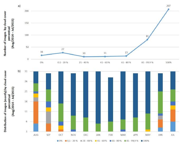 The cloud mask time series contained 365 images (August 2014/July 2015), of which 207 images had total cloud coverage (56.7%) and 81 images (22.2%) ranging from 81 to 99.9% cloud coverage (Figure 4). Therefore, approximately 80% of the images emphasized the strong presence of clouds in the region, and the cloud-free images were poorly distributed throughout the year. Cloud cover intensified in the months of the rainy season between October and March, while the lowest cloud cover occurred in the period from June to September.