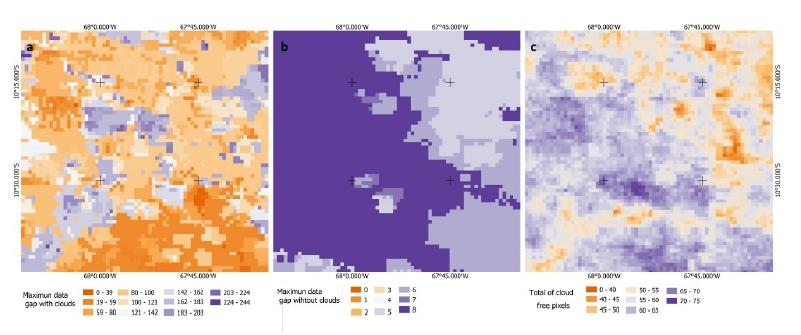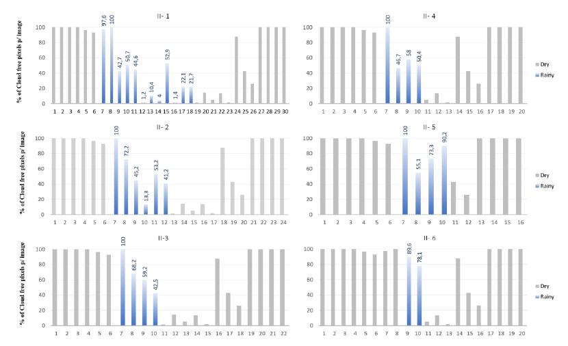 The persistence of cloud cover occurred in the first months of the dry season (mainly in April), while images with 100% valid observations happened in the transition between dry and rainy seasons (October) (Figure 8).