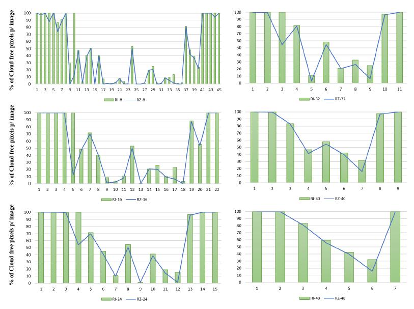 The RI-16 model resulted in 22 images of which only 6 (27.3%) had 100% of the information. The RI-24 and RI-32 tests resulted in 5(33.3%) and 4(36.4%) cloudless images. The RI-40 and RI-48 models resulted in only 3 images with 100% valid observations. The RI-48 test produced the highest proportion of images with valid observations, with 42.9% of the total. Tests with viewing angle constraint (RI-Z) presented fewer images with 100% valid observations in all periods. The RI-Z-8 test showed the highest proportion of cloudless images (2 of 7 images). Both tests (RI- and RI-Z) obtained images with a percentage of 80 to 99% of cloudless pixels (Figure 6).