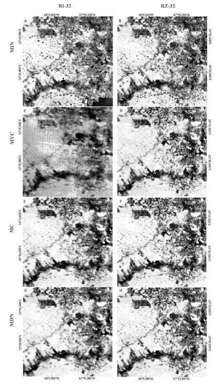 The MAX image presented noisy artifacts and eliminated important natural features like river lines (Figure7). Therefore, high, or low CV values may represent quality loss and should be calibrated by reference value. As in the direct subtraction between the reference and composite images, the results of the diminution of the CV images also showed superior results for the MDN method.