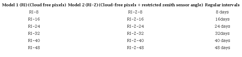 In the 8-day composite images (RI-8), 11 images have 100% information from a total of 45 images, representing 24.4% (Table 3). SZA restriction decreases to 7 (15.6%) images. Most of the resulting images have up to 20% of the information.