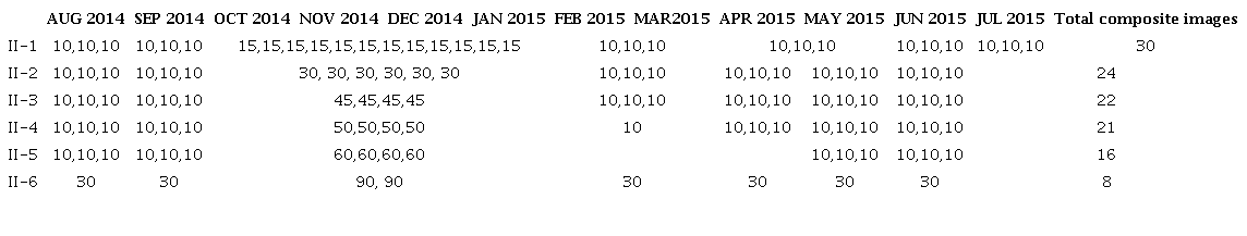 The irregular interval composite images adopted different composition intervals for dry seasons (April to September) and rainy (October to March) (Table 2). The time lag in the wet season increases due to persistent cloud cover. Meanwhile, the dry period used the 10-day range. In the II-4 and II-5 tests, the periods used for the rainy season included April and May days. The last test (II-6) adopted one image per month and at least two in the rainy season.