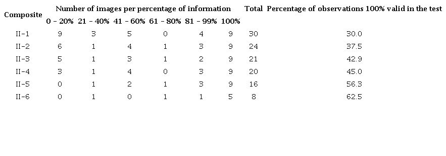 The test II-6 at intervals of 90 days for the rainy season and 30 days for the dry season presented the first composite image of the rainy season with 100% of valid observations and the second with 78.1% (Figure 8). However, the third composite image presented only 18.8% of valid observations, evidencing that April and May concentrate significant cloud cover. In all the tests there were images with proportions of information between 81 and 99.9%, representing the possibility for use.