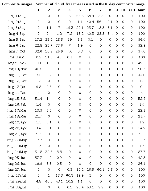 The composite image quality depends on the appropriate specification of the lag time dimension. The image compositions may be unable to detect a specific phenomenon if the length of the lag time exceeds the cycle. There is no single lag time solution for different targets and locations. Various studies assess the remote sensing responses from different lag time dimensions, especially considering the composite MODIS products (8-day and 16-day). The 16-day has been used in phenology detection (WARDLOW et al., 2006; VINTROU et al., 2012). Thus, specific strategies of composite procedure have been developed for different environments and purposes, such as burned areas (BARBOSA et al., 1998; SOUSA et al., 2003; CHUVIECO et al., 2005; 2008; MIETTINEN; LIEW, 2008), wetland and floodplain inundation (CHEN et al., 2013), monitoring vegetation cover (ZENG et al., 2000; YANG et al., 2011) and crop mapping (XIAO et al., 2002; GUINDIN-GARCIA et al., 2012).