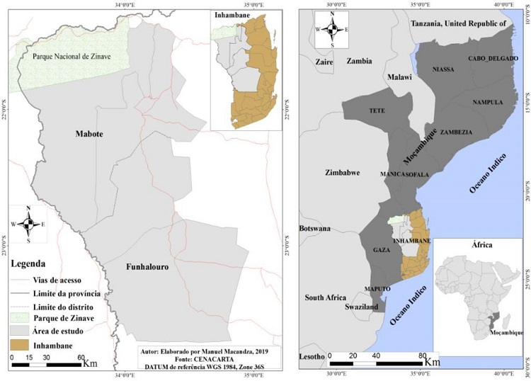 A área de estudo, constituída pelos distritos de Mabote e de Funhalouro, localiza-se a noroeste da província de Inhambane, na Região Sul de Moçambique, sendo limitada, à Norte, pelo Parque Nacional de Zinave (Figura 1).