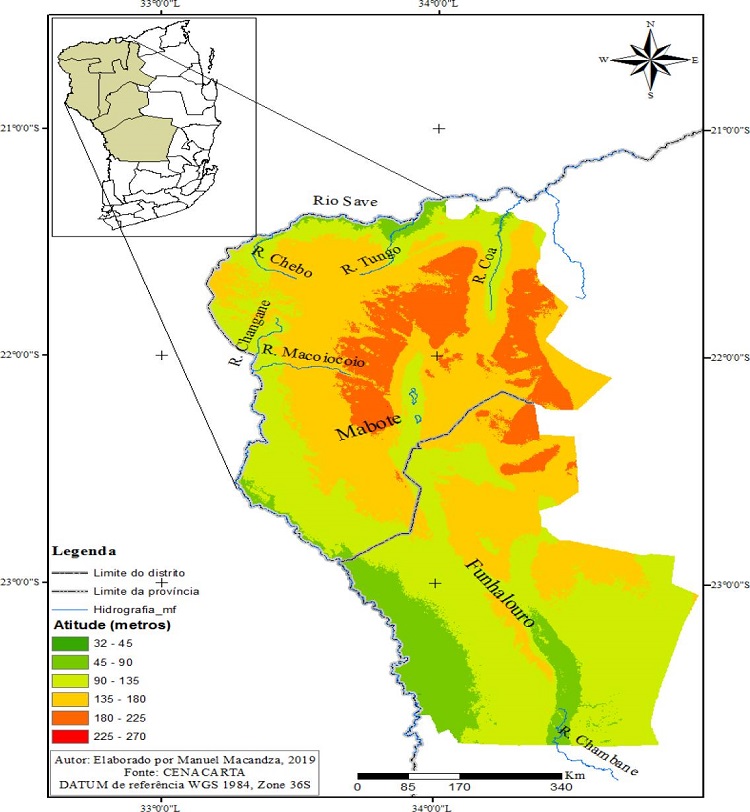 Na Altimetria, tem-se que as altitudes variam de 32 a 270 metros (Figura 2). As classes hipsométricas [90-135] e [135-180] são as que ocupam as maiores áreas, situadas na parte central, sendo relativamente elevadas. Mais elevada é a classe hipsométrica [180-225], predominante em Mabote. A classe hipsométrica [45-90], constituem superfícies de inundação.