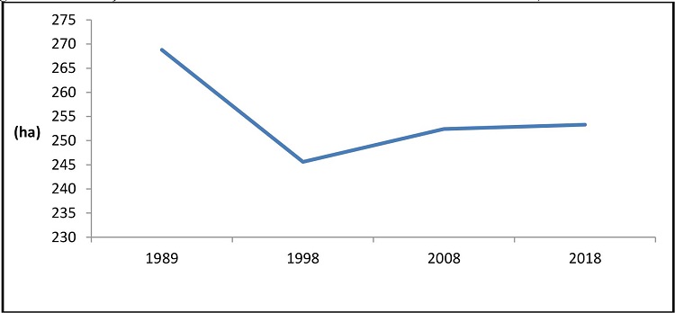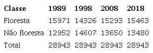 A variação da cobertura florestal se caracterizou ora pela redução, ora pelo aumento de áreas de florestas, ao longo dos 30 anos de observação (1989 a 2018) (Tabela 4). A classe de floresta perdeu uma área de 1.645 km2, porém, de 1998 a 2018, tem se observado uma recuperação da área coberta pela classe. Nesse período, são cerca de 1.137 km2 de superfície ganha.