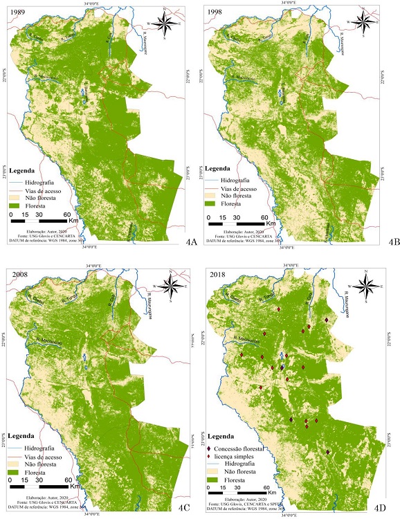Na figura 4D, observa-se a distribuição espacial dos licenciamentos florestais, tanto por licença simples como por regime de concessão florestal, em 2018. A Norte da área de estudo possui mais operadores florestais do que a Sul. Até 1999, uma empresa explorava as florestas, através da licença simples: a Madeira de Moçambique.