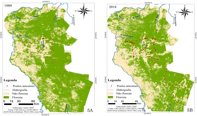 O fenômeno descrito na Figura 3 e na Tabela 4 se reflete, também, nos mapas da variação da cobertura florestal. As informações sobre a dinâmica da cobertura florestal validam a acurácia dos mapas, que é demostrada, a partir dos pontos sobrepostos à área de cobertura florestal.