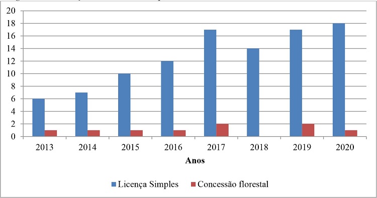De 2013 a 2018, a direção dos Serviços Provinciais de Florestas e Fauna Bravia (SPFFB) de Inhambane recebeu 134 pedidos para licenciamento florestal por LS, contra seis por regime de CF. De 2017 a 2020 os SPFFB registraram de 16 à 18, operadores por LS, apenas na área de estudo (Figura 6). A modalidade é responsável por 80% da exploração florestal na área de estudo.