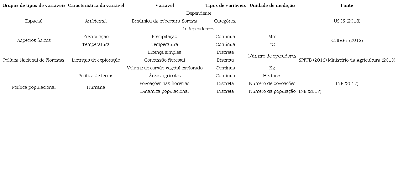 As variáveis que utilizamos são: dinâmica da cobertura florestal; precipitação; temperatura; licença simples; concessão florestal; volume de carvão vegetal explorado; áreas agrícolas; povoações nas florestas; e dinâmica da população (Tabela 1).