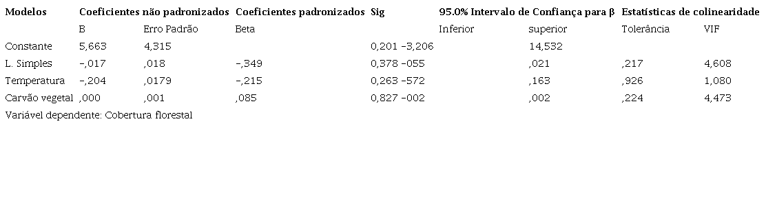 O coeficiente da variável temperatura indica uma probabilidade significativamente negativa de influência na dinâmica da cobertura florestal. Os coeficientes de variáveis LS e volume de carvão vegetal explorado indicam uma probabilidade significativamente positiva (Tabela 3).
