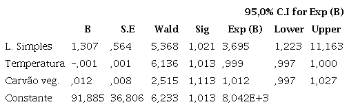 Os valores do teste Wald são: Wald = 5,368 e grau de liberdade (gl) = 1 para LS; Wald = 6,136 e gl = 1 para temperatura; e Wald = 2,515 e gl = 1 para volume de carvão vegetal explorado (Tabela 3). Estes valores revelam o nível de significância individual dos coeficientes e, também, para o modelo em geral (HOSMER et al., 2013).
