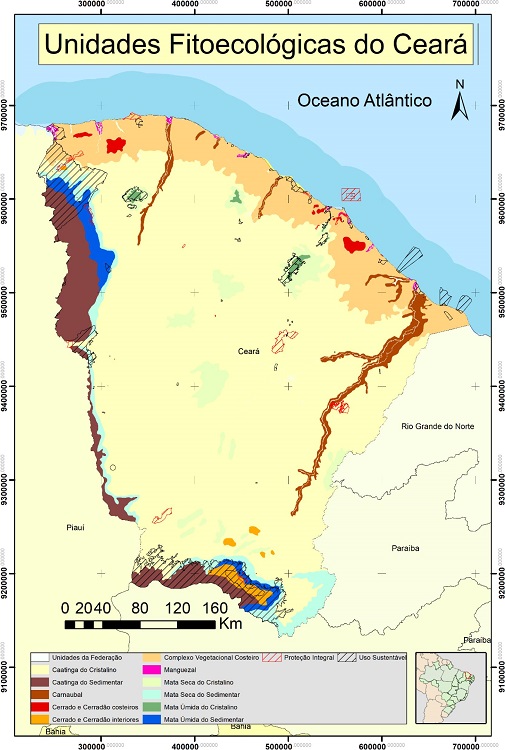 Assim, a vegetação de caatinga sensu stricto é a mais amplamente distribuída no Estado, nas terras baixas da Depressão Sertaneja, mas há também florestas úmidas no barlavento das serras, florestas secas no sotavento das serras, caatinga do sedimentar sobre os terrenos arenosos das bacias sedimentares, savanas, e vegetações costeiras (MORO et al., 2015). Desse modo, a avaliação da representatividade da cobertura de UCs, distribuídas entre as várias unidades fitoecológicas do Ceará, demonstra importante contribuição para o planejamento e gestão da conservação da natureza, bem como identificar os principais tipos de ecossistemas protegidos legalmente no Ceará. Com isso, este trabalho objetivou mapear a distribuição das UCs no território cearense e avaliar a distribuição das UCs entre os diferentes tipos de ecossistemas do estado.