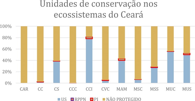 A representatividade dos tipos de vegetação nas categorias de manejos das UCs estaduais foi avaliada por outros pesquisadores, que destacaram que mesmo ocupando a maior parte do território cearense, a vegetação de caatinga é 34 vezes menos protegida do que os ambientes ligados à mata atlântica, como os encraves de florestas úmidas, revelando uma distorção na representatividade do sistema estadual de unidades de conservação (ZIEGLER et al. 2019).