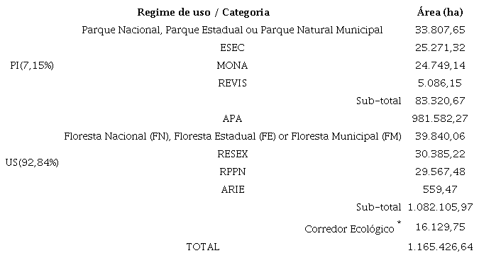 Por outro lado, a área total de UCs do grupo de uso sustentável é de 1.082.105,97 ha, apresentando cerca de 7,27% da extensão de ecossistemas terrestres do estado. As UCs de uso sustentável representam 92,85% da cobertura protegida por UCs do estado, já excluindo as sobreposições (Tabela 1). A maior parte dessa soma está concentrada na categoria de APA, que é a categoria brasileira com menor restrição legal ao uso humano, seguida por FN, RESEX, RPPN e ARIE, categorias com mais restrições de uso no grupo das UCs de uso sustentável.