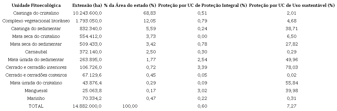 Representatividade ecológica e extensão total de áreas protegidas pelas unidades de conservação no estado do Ceará, Brasil