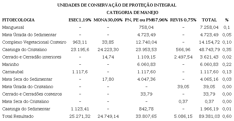 A Unidade de Conservação na categoria ESEC, a mais restritiva, recobre apenas 1,19% do total de UCs de Proteção Integral. Com relação à área total do estado abrange apenas 25.276,292 (0,016%) hectares representando as fitofisionomias do complexo vegetacional costeiro e da caatinga do cristalino e caatinga do sedimentar. A categoria MONA abrange 30,09% de todas as UCS de Proteção Integral, e recobre áreas representantes do complexo vegetacional costeiro, da caatinga do cristalino, do cerrado e cerradões interiores e da mata seca do sedimentar. A Categoria Parque é a mais comum, representa 37,83% de todas as UCs de Proteção Integral e recobre a maior parte das fitofisionomias, com exceção das matas úmida e seca do cristalino e a caatinga do sedimentar. A categoria REVIS abrange apenas 0,75% da área de todas as UCs de Proteção Integral, e abriga as unidades fitoecológicas da caatinga do sedimentar, e matas úmida e mata seca do cristalino.