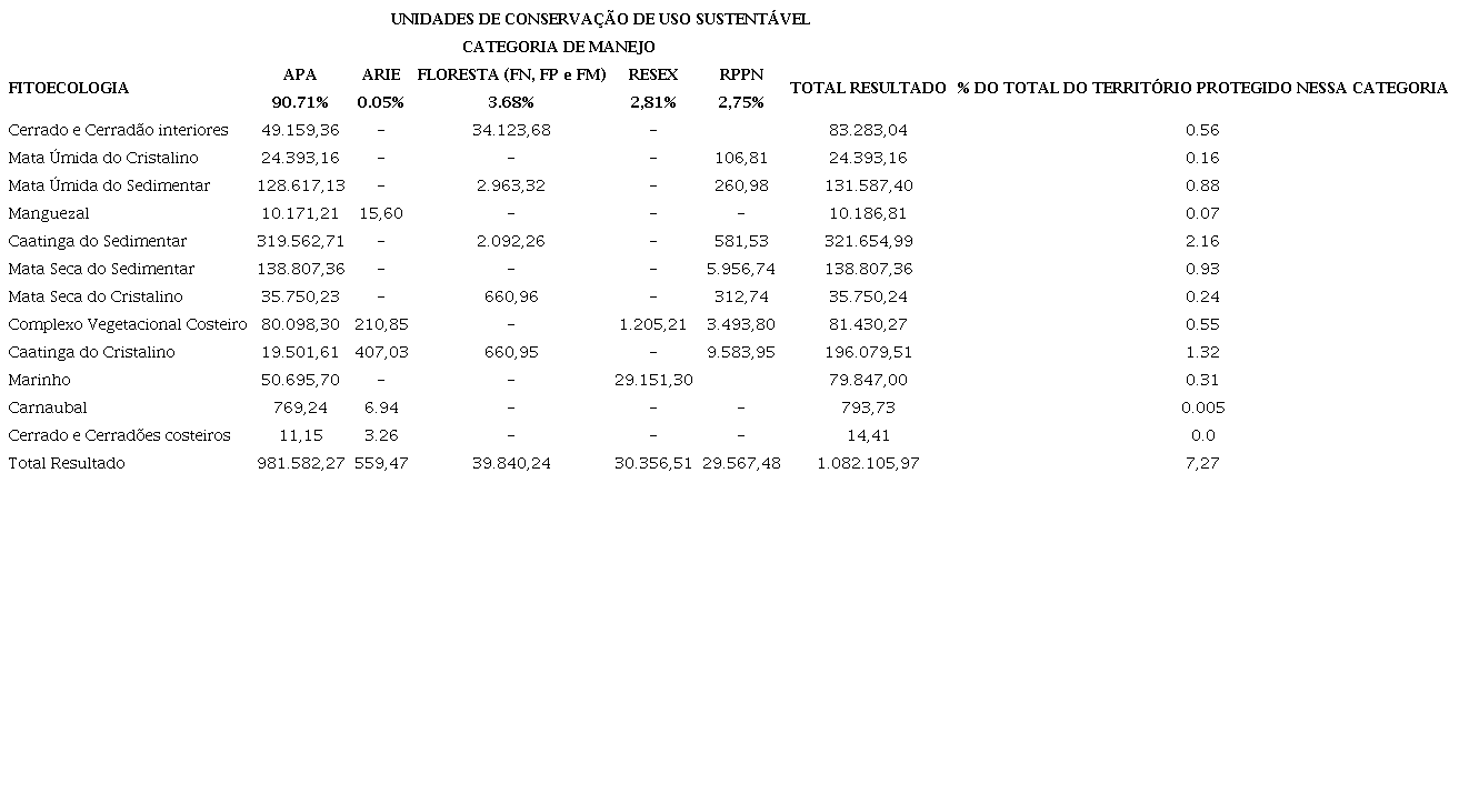 Ao contrário das UCs de proteção integral, que possuem áreas bastante pequenas, as de uso sustentável ocorre em todos os ecossistemas, conseguindo superar os 10% de proteção de algumas unidades fitoecológicas, individualmente. Na contramão desse feito, a maioria das UC desse grupo se concentra na categoria de APA, uma das categorias com menor restrição de uso e com pouca efetividade de proteção. As APA de maior dimensão estão sobre os Brejos de altitude, como Araripe, Aratanha, Baturité e Ibiapaba, não havendo nenhuma grande unidade desta categoria sobre a caatinga do cristalino.