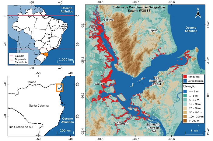 O complexo estuarino da baía da Babitonga localiza-se entre as latitudes 26° 07’ e 26° 27’ sul, caracterizando-se por ser o maior complexo estuarino do Estado de Santa Catarina. Possui uma área de 160 km2, e a sua bacia hidrográfica apresenta uma superfície de 1.567 km2, drenando terrenos de cinco dos seis municípios que circundam o estuário,com o limite norte da ocorrência de zonas úmidas sendo verificado nos municípios de Itapoá, Joinville e Guaratuba e ao sul nos municípios de Araquari e Balneário Barra do Sul (Kilca et al., 2019; Vieira et al., 2008). Em termos de geomorfologia, a região é classificada quanto à geomorfologia como Ria, ou vale de rio afogado pela elevação do nível do mar, sendo preenchida, principalmente, desde o quaternário superior, por sedimentos fluviais e estuarinos (Mazzer; Gonçalves, 2012). O ambiente oceânico adjacente é classificado com o regime de micromarés (marés inferiores a 2 m), no entanto ocorre no interior da baía uma amplificação da altura de maré devido ao estreitamento do canal principal, gerando uma elevação de até 2,3 m (Kilca et al., 2019; Truccolo et al., 2006; Truccolo; Schettini, 1999).
