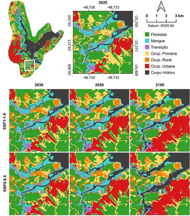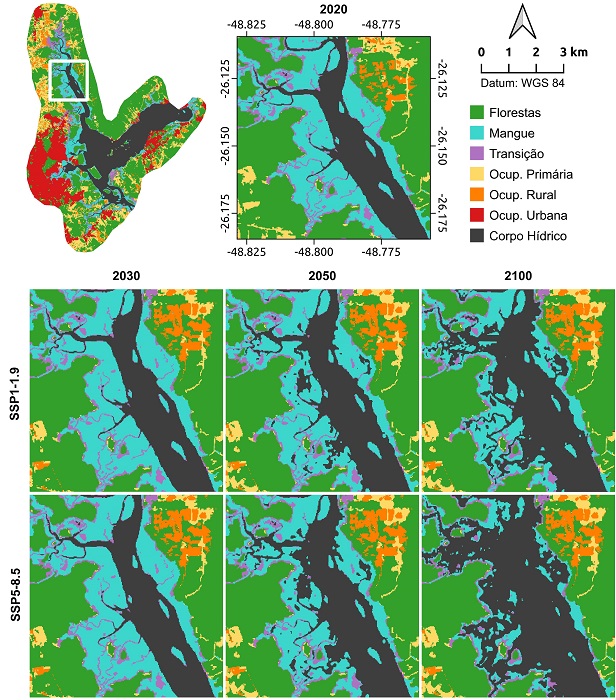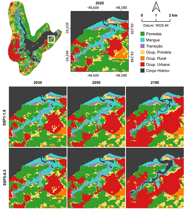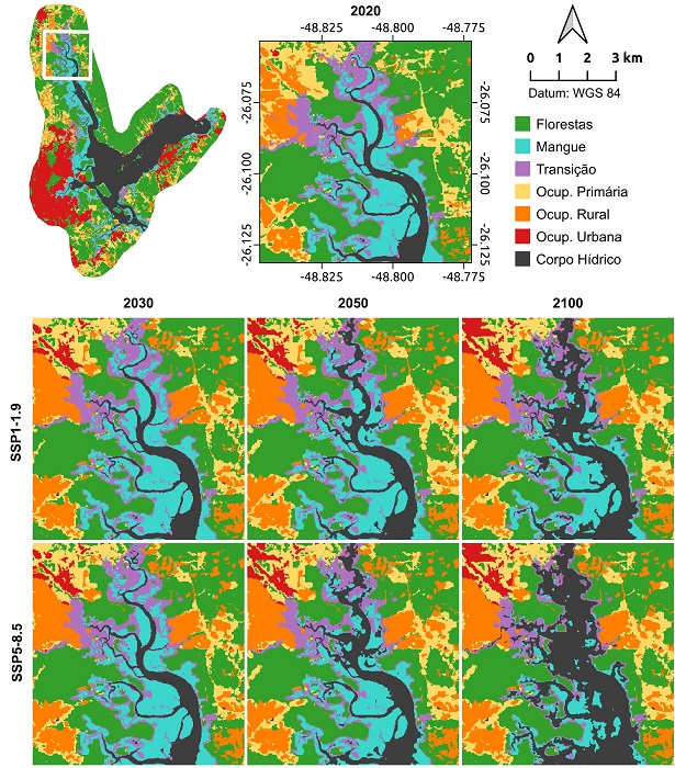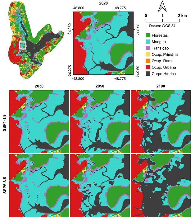 Os resultados obtidos indicam que as ZUCs da baía da Babitonga apresentam tendência de aumento de 106,9 km2 em 2020 para valores entre 108,3 km2 em 2030 (SSP1-1.9) e 116,7 km2 em 2100 (SSP5-8.5). Apesar deste aumento em área, observou-se um contínuo decréscimo do percentual de ocupação, pelas áreas originais de mangue e de zonas úmidas em geral (Mangue + Transição), em detrimento tanto de áreas de florestas terrestres quanto das três classes de ocupação/uso humano, restando 26,4 km2 de Mangue e 20,52 km2 de Transição em 2100, considerando o pior cenário de elevação do nível do mar (SSP5-8.5). Estas áreas representam 57,86% e 31,12% das áreas de 2020, respectivamente (Tabela 1).