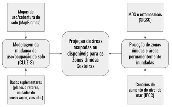 A metodologia empregada divide-se em duas etapas principais: a primeira envolve a projeção da elevação do nível do mar, enquanto a segunda está relacionada com a projeção das mudanças no uso/cobertura do solo (Figura 2).