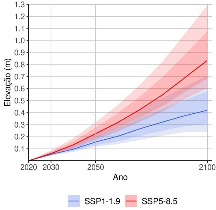 Para a projeção de cenários futuros de aumento do nível do mar, utilizou-se o percentil de 50% de dois Caminhos Socioeconômicos Compartilhados (Shared Socio‐Economic Pathways - SSPs) apresentados no Sexto Relatório de Avaliação (AR6) do Painel Intergovernamental sobre Mudanças Climáticas - IPCC (Masson-Delmotte et al., 2021):